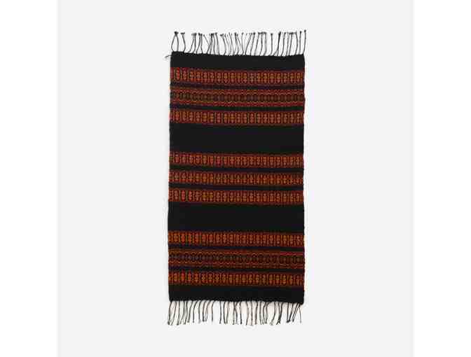 Flesberg table runner weaving by Vesterheim Gold Medalist Syvilla Tweed Bolson. Woven of Norwegian Spelsau klegarn wool in the Flesberg Bound Weave technique. The weaving is 33 1/2" long and 18" wide.