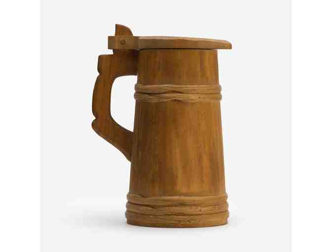 Handmade wooden tankard with stave construction by Jim Berquist. The pitcher features a hinged lid, and carved handle. The body of the pitcher is embellished with two split twig bands, one around the top and one around the base. The tankard is 10 1/2" tall and the diameter of the top opening is 3 1/2".