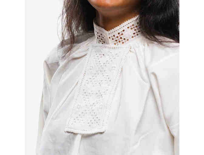 Hardanger blouse with Hardangersm embroidery on collar, cuffs and front placket (aka placquet). New old stock. Ordered but never worn by Elsa Friberg from the Oslo Husliden, in the 1970's or 80's. Size large. *2 spots on left sleeve and right side of blouse front, as well as some discoloring. length 27", width (armpit to armpit) 28 1/2", sleeve length from collar to end of cuff 29 1/2"