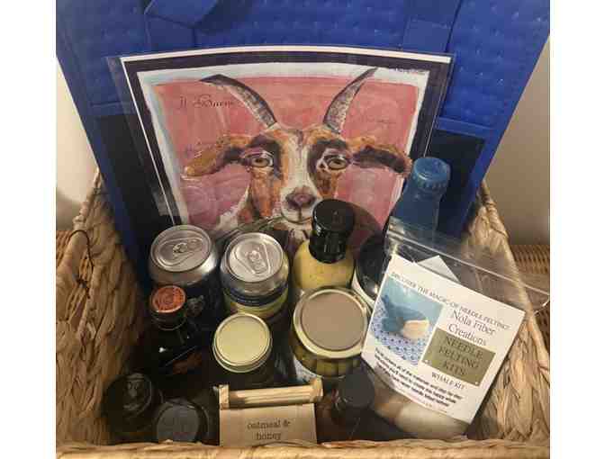 Contains: 2 cans of Cloudscape India Pale Ale from New Park Brewing, Vidalia Onion & Honey Mustard Dressing from Creative Living Community of CT, Pure Connecticut Maple Syrup from VanDana Farm, 2 bottles of Misfit Spices, Dilly Beans and a candle from Little River Farmstand, a needle felting kit from Nola Fiber Creations, Dragon's Blood Elixir Hot Sauce, a 9x12 art piece from Timeflies by Lauralie, a bottle of Blueberry Cider from Yankee Cider Co., honey from Stonewall Apiary, oatmeal and honey goat milk soap and a soap rack from Catbird Soaps, and an insulated Coventry Farmers Market tote bag.