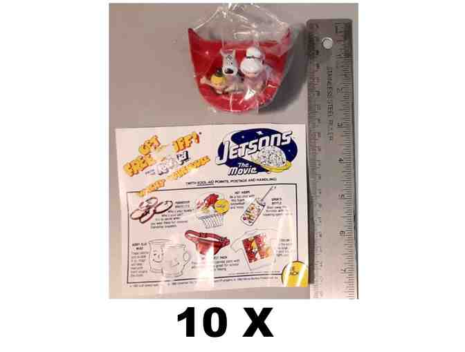 DESCRIPTION: This is a DEALERS LOT of 10 of the same Jetsons toy.  Each solid original promotional toy measuring 3x3x2 and features Judy, Elroy and Astro in a flyer. These promotional toys were given out at the premiere of the Jetsons: the Movie.