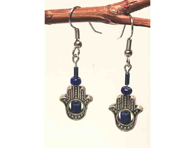 These 'Hamsa, Hand of Protection earrings' are made with pewter and lapis lazuli, were thoughtfully handmade by Betsy Roberts right here in Arcata for BGHP's online auction.