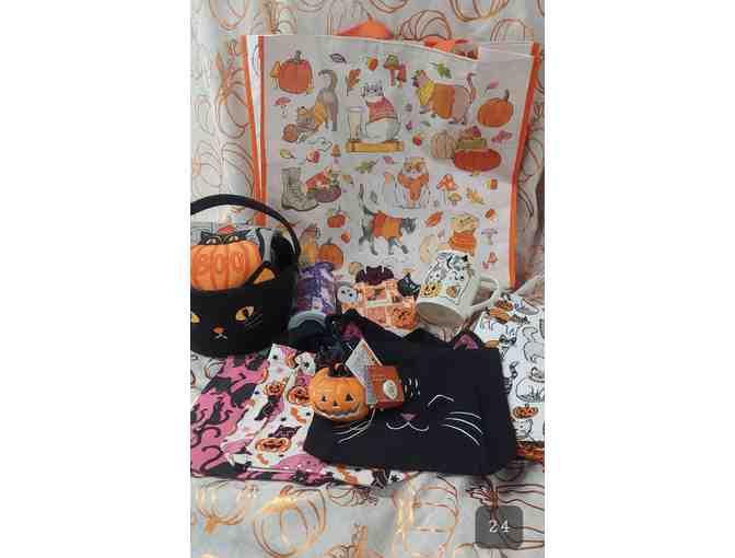 Halloween printed rug 24" x 36", 17 oz cat mug, Hey Boo Vanilla hand soap, braided cat basket, 2 sets of spooky dish towels (6 total), 3 fabric kitty treat totes, Halloween hair clips, and a ceramic light-up cat w/ pumpkin.