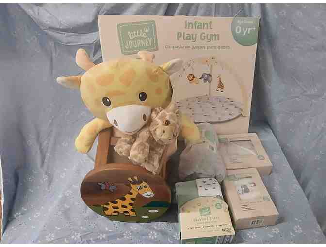 Bring this charming jungle to your nursery. Baby washcloth set 10" x 10", 100% cotton bassinet sheet 33" x 18", baby hooded towel 30" x 30", soft baby blanket 30" x 40", large huggable plush George the Giraffe, Infant Play Gym 32" diameter playmat, adorable wooden step stool 10", and a small plush giraffe. NO SHIPPING ON THIS ITEM