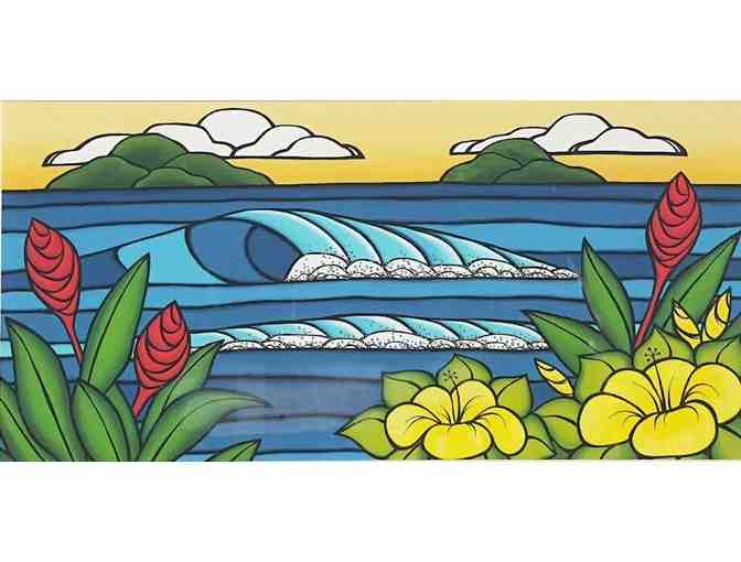 "Hawaiian Island Paradise" by local artist Heather Brown is a playful and vibrant celebration of tropical motifs, infused with Brown’s signature bold lines and vibrant color palette. The piece features playful, rolling surf and our wonderful tropical flora, evoking the laid-back, fun spirit of island life. The saturated greens and blues in the foreground play against the soft peach background, drawing the eye into the heart of the composition, while Brown’s smooth curves and fluid lines bring an overall sense of movement and joy.