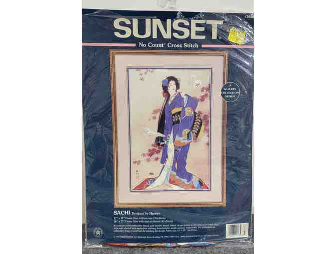 Bring the graceful beauty of "Sachi" to life with this stunning Sunset Stamped Cross Stitch Kit!