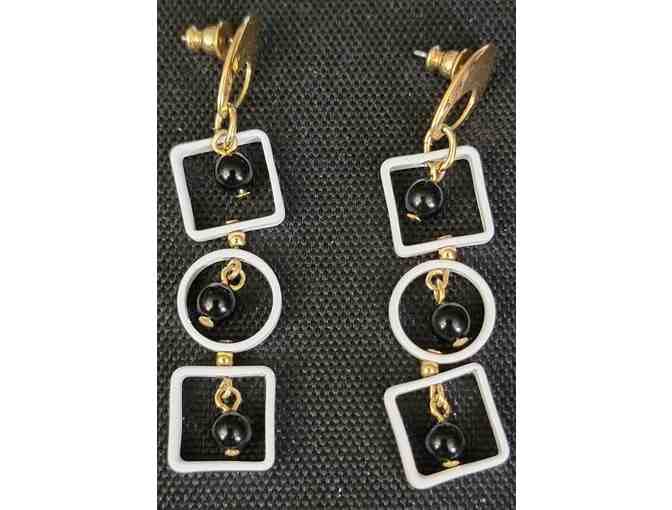 Add a bold retro accent to your outfit with these vintage beaded earrings featuring a striking black and white geometric design. With a playful combo of square and circle shapes, these earrings blend Art Deco inspiration with 90s flair.