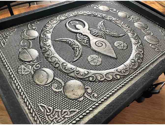 Discover the perfect place to store your cherished keepsakes with this handcrafted wooden box, featuring a striking metal top adorned with artwork entitled Triple Moon Goddess. This potent symbol of the divine feminine represents the Maiden, Mother, and Crone, embodying the waxing, full, and waning moon cycles.