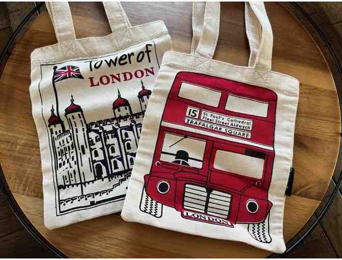 Carry a piece of London with you with this adorable set of two small canvas totes. Perfect for carrying small items or as a charming keepsake, these totes were purchased in London, England. The first tote features a famous red double-decker bus, a classic symbol of the city, with its destination proudly displayed as St. Paul's Cathedral. The second tote depicts the historic and iconic Tower of London, a landmark rich with history and tales. Both totes are a cute and practical way to celebrate the vibrant culture and history of one of the world's greatest cities.