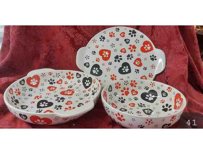 Pawprints galore make for festive get-togethers! 2 serving bowls 1-10" and 1-12" in diameter and a 12" round serving platter. Oven/dishwasher and microwave safe. NO SHIPPING