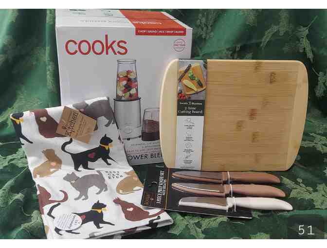 This Cook's 5-in-1 Power Blender is powerful, easy to use and chops, grinds, mixes, whips and blends. We get you started on your first project with a 3 pc. prep knife set, bamboo cutting board and dual-purpose kitchen towel.