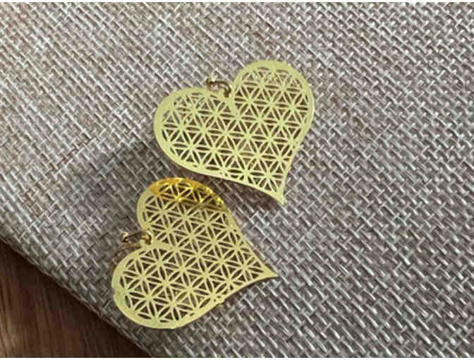 These beautiful gold-plated earrings feature a unique blend of two powerful symbols. At their center, a finely cut Flower of Life pattern is nestled within the universally recognized shape of a heart. Each earring is a testament to intricate detail and craftsmanship, combining the symbolic representation of connection and creation with the deep meaning of love. They're a perfect accessory for anyone who values both beauty and symbolism. The earrings come with stoppers for a secure and comfortable fit.