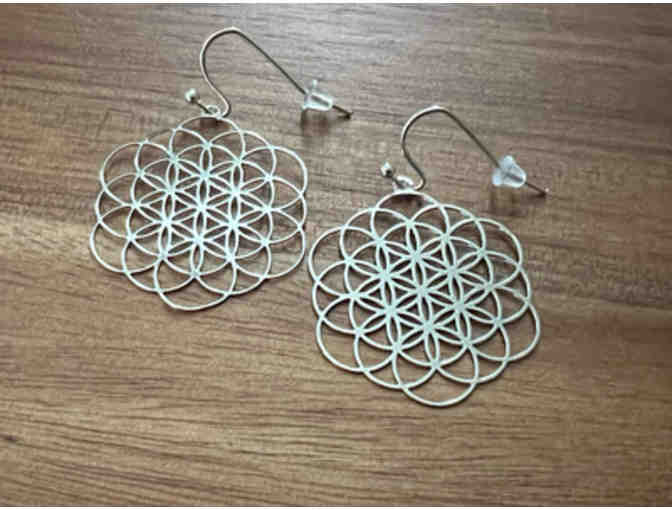 These striking, silver-hued earrings feature a beautifully expanded Seed of Life pattern. Each 30mm earring is cut with incredibly fine detail, creating a delicate, yet intricate design that captures the eye. This expanded pattern adds a unique layer of complexity and beauty to the timeless symbol of creation. The earrings come with stoppers to ensure a secure and comfortable fit.