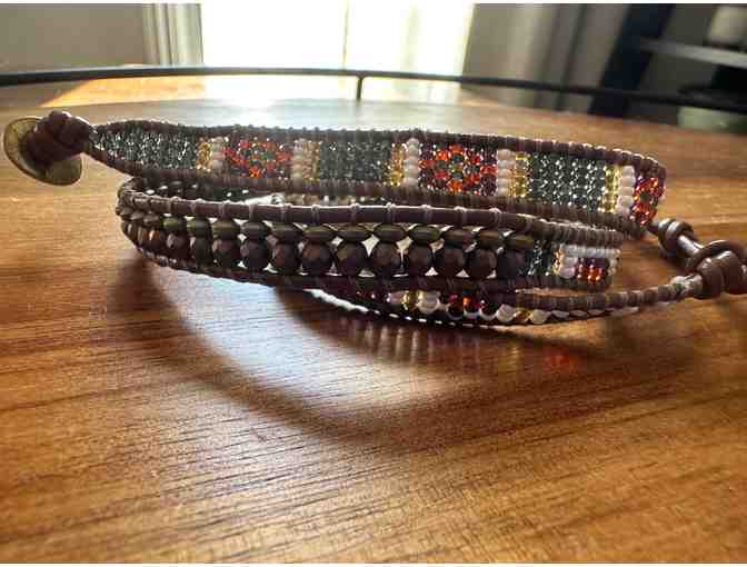 This stunning wrap bracelet is a perfect accessory for the fall season. Crafted with a beautiful array of beads in rich autumn colors—think deep reds, warm oranges, rustic browns, and bright whites—it wraps gracefully around the wrist. The mix of colors and textures creates a unique and eye-catching piece that complements any outfit.