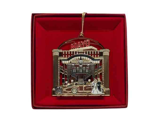 The Mayo Hotel was built in 1925 as a luxurious stay for famous visitors. The ornament shows both outside & inside views of the building. Outside shows 2-story columns, black entryway canopy, rooftop balustrade, and the Mayo sign. Inside, you see the Grand Hall with Art Deco staircase, chandeliers, and a celebration. The front show the Mayo logo & a vintage car with a happy couple. An important keepsake! The ornament is made with solid brass with a 24k wash in a red leatherette gift box with a descriptive insert.