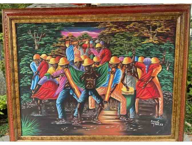 This beautifully framed artwork captures a lively and joyful moment in Haitian culture, where people are seen dancing energetically and playing traditional instruments. The scene is filled with movement and life, reflecting the spirit and communal energy that define many Haitian celebrations.