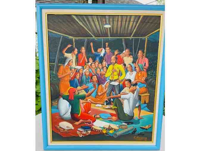 This Haitian artwork depicts a small gathering of local people, assembled at night beneath a tin roof that stands without walls. The group consists of men, women, and children. Their clothing is a mix of bright colors and simple earth tones, reflecting traditional Haitian style.