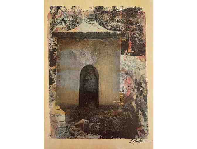 This original mixed-media artwork by local artist Carol Meckling features one of the iconic "temples" Lawai International Center is known for. The lovingly handcrafted shrine sits solidly along the 88 Shrines pilgrimage path while a shadowed Buddha gazes tranquilly at the visitor from the interior. The scene evokes the humble spirit and sense of serenity that a pilgrim experiences when hiking the path toward their destination. Though the destination may not be revealed until one reaches it, the path is welcoming and clear.