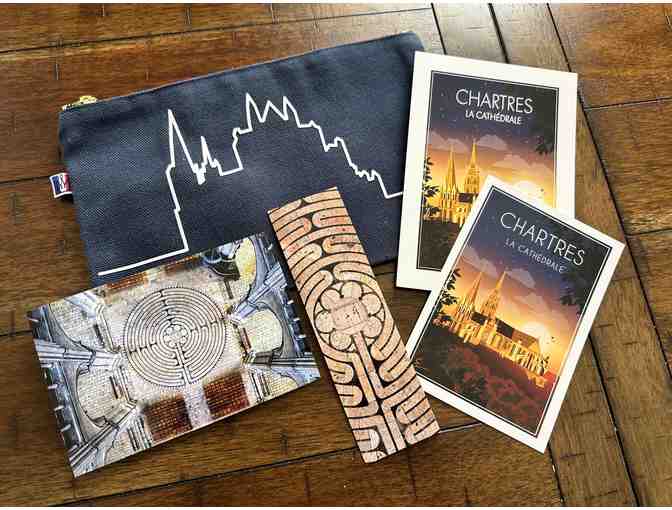 The focal point of this package is a high-quality, zippered navy blue canvas pouch with a clean white outline of the cathedral's silhouette on the front. Made in France, this pouch is perfect for carrying your essentials. The set also includes three postcards of Chartres, each a unique piece of art, and a beautiful bookmark featuring the Chartres Labyrinth.