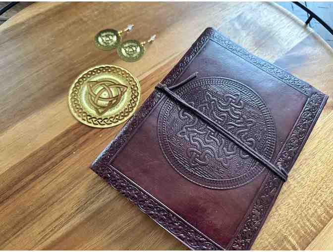 This beautiful auction lot is a perfect collection for anyone drawn to the rich history and beautiful artistry of Celtic design. The package includes a stunning leather-bound journal with an intricate Celtic knot design embossed on the cover, perfect for writing, sketching, or personal reflection. With a wrap around closure, it perfectly tucks in additional notes securely and keeps the beautiful paper pristine. The set is completed with a pair of elegant gold-plated earrings and a gold-plated healing grid, both featuring a Celtic trinity knot.