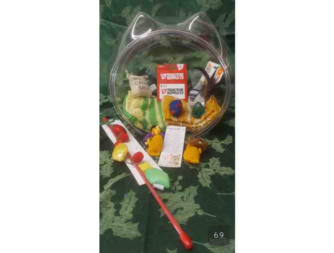 This clear acrylic cat bed is unique and is 12" deep and 11" high. It comes with 2 mats and a great selection of toys. AND this $50 Tractor Supply GC will buy you cat food, litter or whatever else you need "out there".