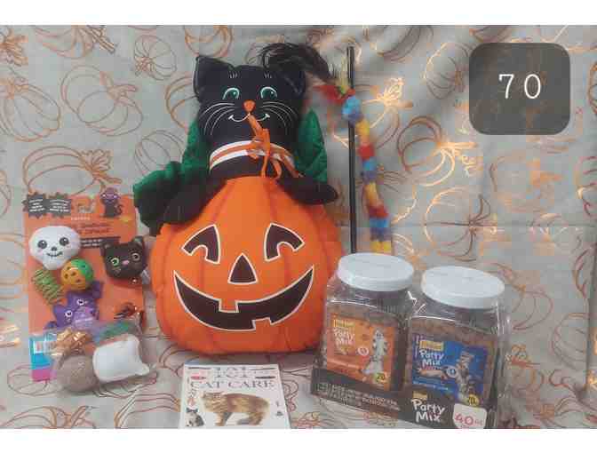 Hand-crafted happy black cat in a pumpkin sets the mood for this kitty treat and play package. Lots of toys and 2 giant jars of treats are sure to be a hit!