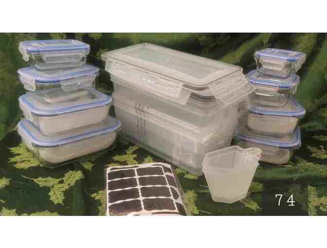2 sets that will keep your fridge and cupboards in good shape! Set of 4 plastic 3.2L (11.25"L x 6"W x 4.5"D)containers with lids and included scoop and labels AND set of 8 sturdy assorted size glass containers with lids. Containers w/o the lids are dishwasher, microwave and oven safe.