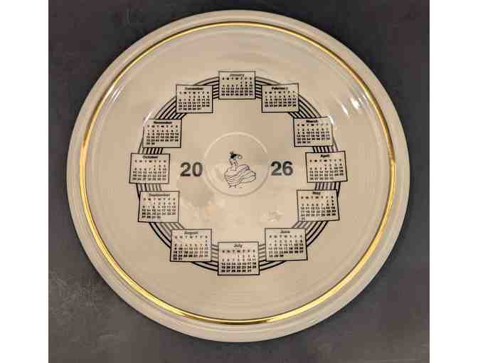 2026 Calendar Plates made by taking Fiesta Dinner Plate glazed in 2025 color Linen donated by FTC in Newell, WV, with 2026 Calendar Decal donated by Commercial Decal Company in East Liverpool, and decorated by W.C. Bunting Company in East Palestine, OH. Made Exclusively for the ELHSAA Pottery Auction Marked #4 of 12