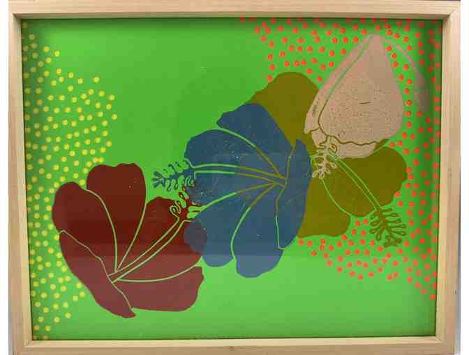 This vibrant handmade artwork by Kauaʻi artist Shannon Hiramoto features a bold block print of layered hibiscus flowers, Hawaiʻi’s state flower. With a striking neon green background dotted in red and yellow, and blossoms in earthy shades of cream, olive, cobalt, and crimson, the piece beautifully balances traditional floral imagery with a contemporary pop-art energy.