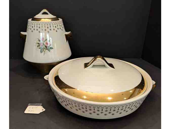 Hall China Flare-Ware Cookie Jar and Covered Dish Gold Trim