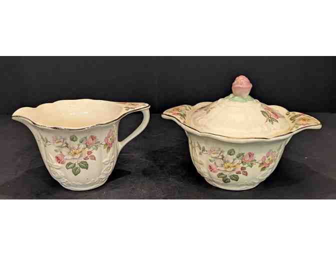 sugar and creamer with in floral pattern, dark spots under the glaze in the sugar