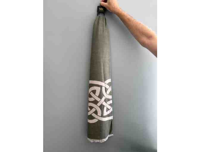 An authentic Book of Kells reversible fashion scarf from Trinity College Dublin, made of Viscose. One side is a lovely forest green with white Celtic knots and the other side is white with green knots.