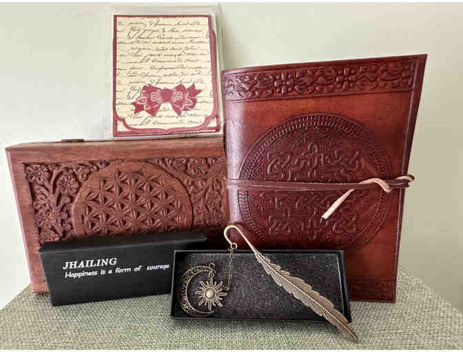 Who doesn’t love a beautiful, hand-carved wooden box? Based on sacred geometry and featuring a Flower of Life motif, this box honors the connections that run through all living things and would be right at home on a table, shelf or a quiet spot of contemplation. Lined in velvet, it’s a perfect spot to keep small treasures, meditation beads and jewelry or to organize items out-of-sight. The leather journal features unlined sheet, making it ideal for journaling as well as sketching and drawing. To mark your place, this grouping includes an artistic sun and moon bookmark. And there’s even a small set of charming notecards. The box measures 7" x 5” x 2.37”.