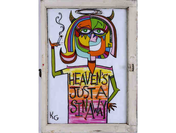 "Just a Sin Away" is a reverse painting on glass, using acrylics, spray paint and markers on an antique window. The artist is often inspired by music, and this piece is based on The Kendalls song "Heaven's Just a Sin Away." Grady hopes the bright colors and playful approach provide a fun narrative, and perhaps ask the viewer, "how can heaven be just a sin away?"