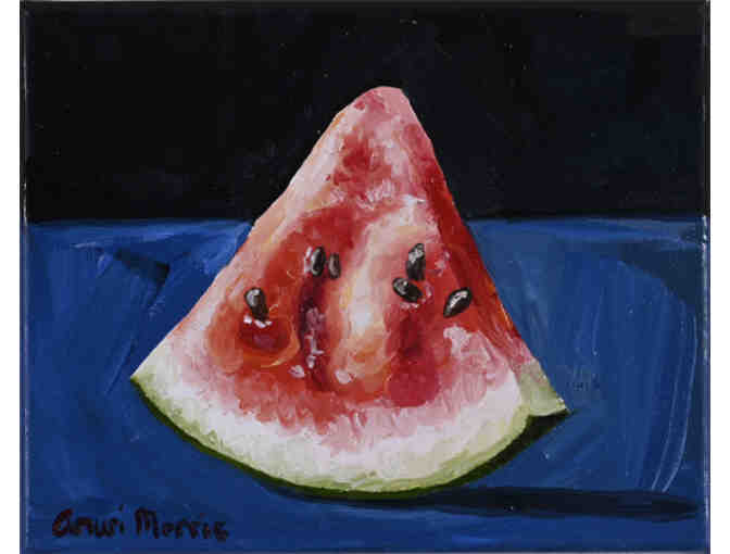 This piece was inspired by the simple moment of enjoying a watermelon slice. The colors are vibrant and happy, watermelon represents summer and heat and things we love. Morris loved the simplicity - it's not a beach scene, it's not a still life, it's just a slice of wonderfulness!