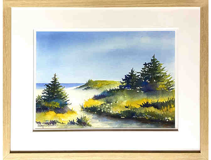 Mary Wojciechowski's favorite subjects are derived from any coastal area, especially along the shorelines of MA and RI. Although she is primarily a plein air painter, "Beach Pathways" was painted from photographs taken of a beautiful beach found in Harwich Port while vacationing. What drew her in was this cluster of evergreens growing out of the sand that added a "glimpsing through" perspective she found captivating. Mary has since painted many variations of this view.