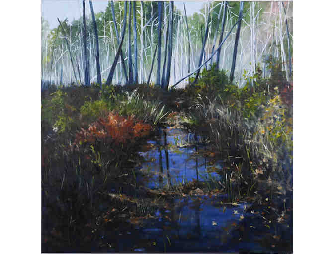 "Ghost Dance" is part of a series of landscapes Evans painted for his 2023 solo show at True Grit Gallery in Middleboro, MA. It is a depiction of a view from the path leading from the parking lot to Joe's Rock in Wrentham, MA.