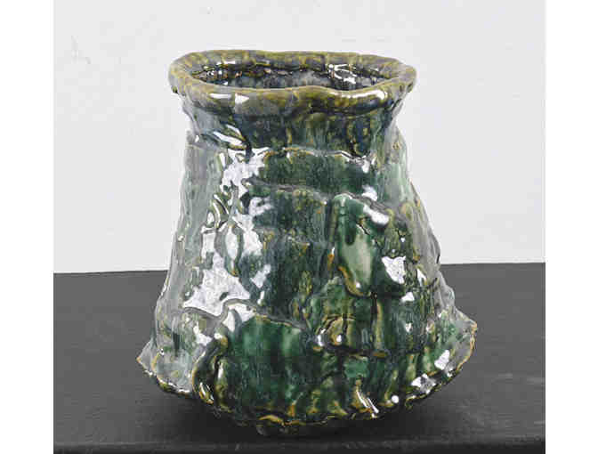 "Green Vessel" is a handbuilt object in a unique style using ripped clay pieces to create an undulating surface built up to form the piece. Several layers of differing glazes have been applied to give the surface a fusion of color. The process includes purposeful openings in the vessel allowing access to the inside. It will not hold water. Other uses may be found.