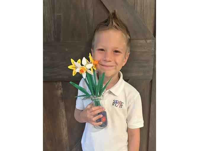 So it's easy to see why this project inspired the youngest heart here in our family, and in September Colton decided to donate his carefully crafted lego daffodils that he assembled for our 2025 auction. We've paired it with a small vase, adorned with a labyrinth sticker. The arrangement measures approximately 12 inches tall.