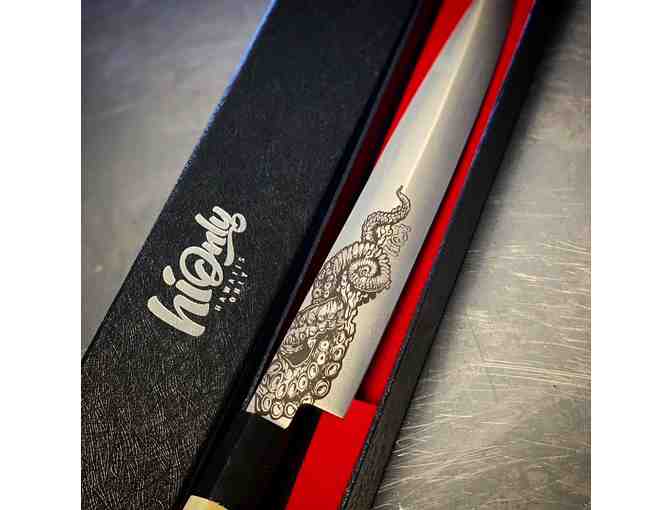 8 inch Chef Knife, VG10 steel, custom handle and gift box. Hawaiian artwork.