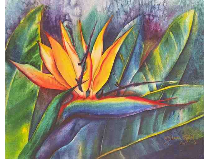 Midnight Birds by Hawai‘i artist Sheree Latif beautifully portrays the striking Bird of Paradise flower set against a backdrop of lush tropical greenery. The vibrant colors of the bloom glow vividly against the deep, serene tones of the surrounding foliage, evoking the quiet magic of a tropical evening.