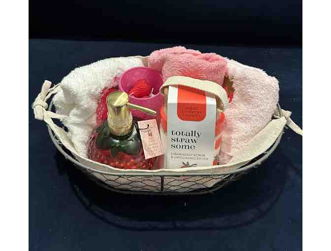 A delightful basked filled with strawberry hand cream, strawberry body scrub, strawberry scented mini-votive candles and three hand towels. Wrapped and ready to be regifted.