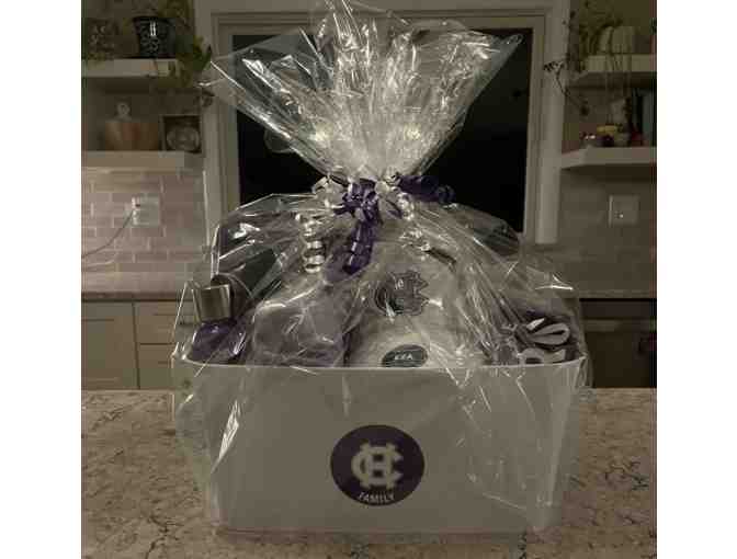 Show your Holy Cross pride in many different ways and looks! The bin contains the following:1 - baseball cap; 1 - water bottle; 1 - pair of sunglasses; 1 - Sweatshirt ( Large); 2 - T-shirts (L, XL); 1 - Frisbee; 1 - computer bag; 1 - blanket; 1 - journal; 1 - coffee cup; 1 - deck of playing cards; 1 - pen = 12 total items"