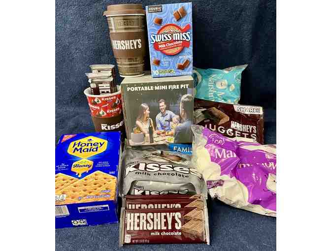 All you need for a S'mores and hot chocolate snack! Graham crackers, 2 sizes of marshmallows, lots of Hershey's chocolate, 2 mugs, Swiss Miss Keurig pods AND a mini tabletop outdoor firepit to get the party started!