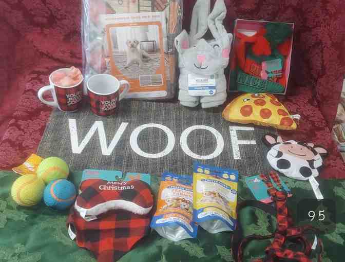 Remember Fido! Rugged 12"x24" Woof doormat, 2 Pawsome mugs, 3 dog toys, Loobani Washable Pee Pad 36"x48" to protect your floors, hooded towel 50"x23", harness M/L, and "Nice" hat for parent with "Naughty" hat for dog S/M.