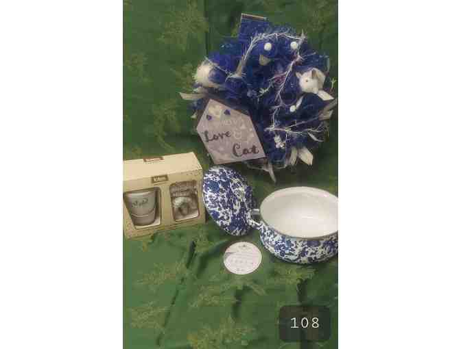 Deep blues and silvers evoke the season to get cozy. 2.5 qt. Golden Rabbit Dutch oven is perfect for a tasty soup to warm your insides. Totes travel mug and flip-mitt gloves keep you toasty outside and this colorful wreath will warm your spirit.