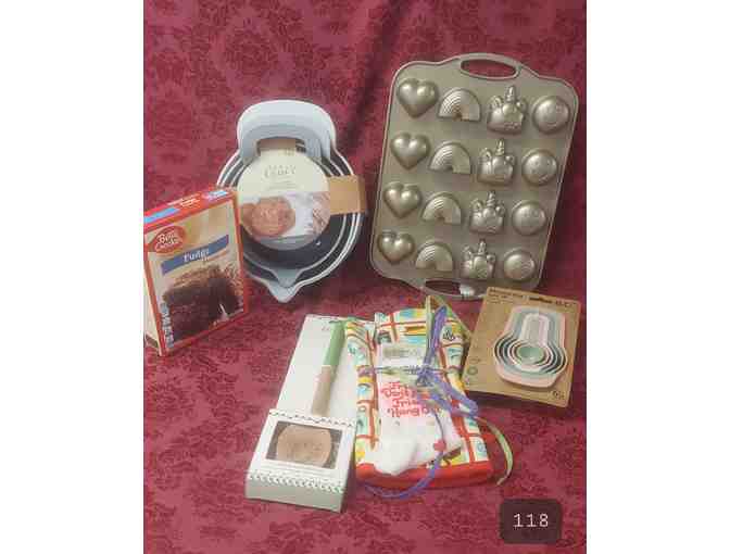 Yum! Here are the ingredients for an enjoyable baking project. William Sonoma cakelet pan, 3 piece mixing bowl set, 6 piece measuring cup set, oven mitt, brownie mix and even some fun socks!