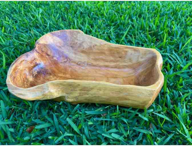 This item is a sustantial wooden bowl that was hand-carved from wood. It is quite heavy and measures 16 3/4" overall with a height of 4 1/2": the irregular width varies from 13" to 7 1/2". The creamy-colored wood exhibits a smooth, sensual texture and a mesmerizing grain pattern. This large piece can be used as a display item or would be a perfect as a fruit bowl or a serving dish for salads, breads, pasta, etc. It is sure to draw attention from your guests when they come over for dinner.
