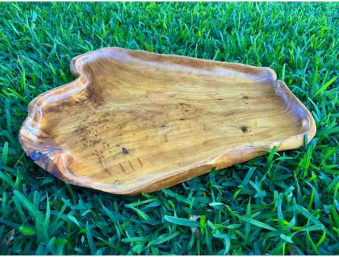 This fine wooden platter was hand-carved from wood. The irregular shape measures 20" in overall length while the width varies from 17" to 9 1/2": it is 2" high. The creamy-colored wood exhibits an striking grain pattern while the surface shows off its smooth, sensual texture in the images. This item would make an excellent serving tray for all manner food and drinks when your friends stop by to visit.