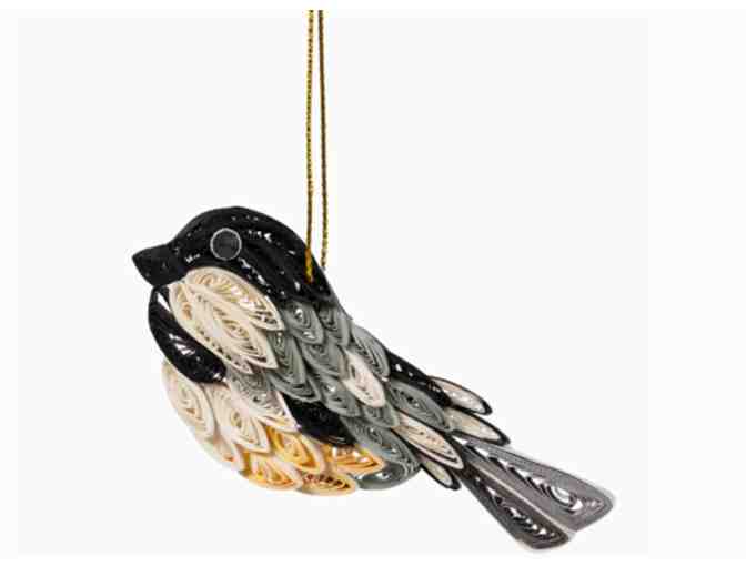 A Christmas chickadee for your Christmas tree - a unique ornament with creative 3D feathers made from quilled recycled paper. Handcrafted in Vietnam by fair trade artisans, this Christmas ornament hangs from a metallic gold thread.